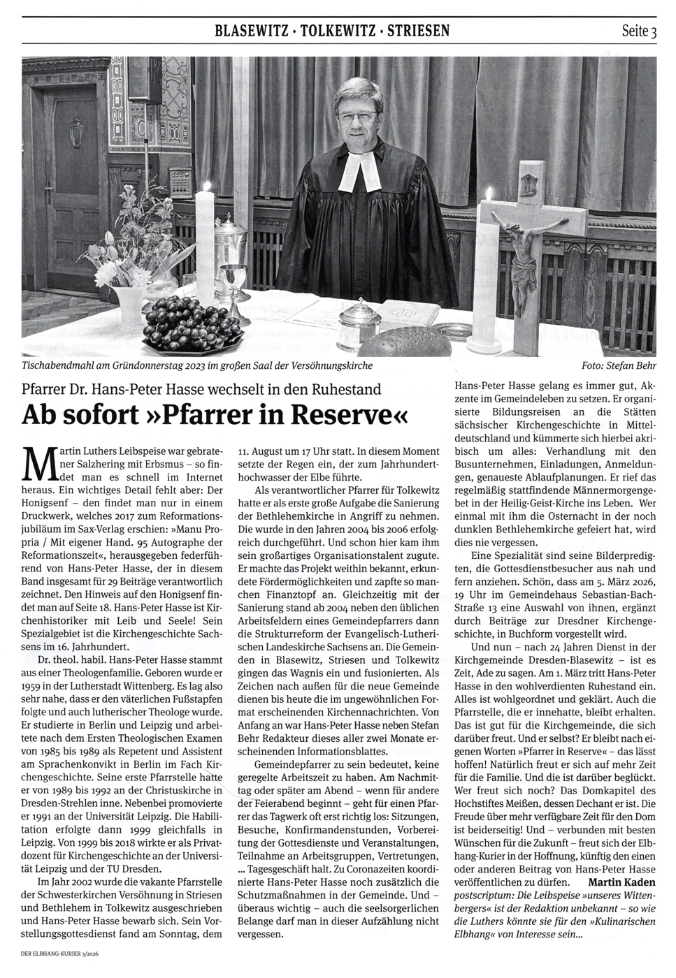 Pfarrer Dr. Hans-Peter Hasse wechselt in den Ruhestand.