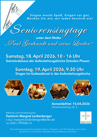 Wenn Sie gerne ein Wochenende mit viel Musik und netten Menschen verbringen möchten, dann lassen Sie sich zu den Seniorensingtagen in der Auferstehungskirche Dresden-Plauen einladen. Gemeinsam mit der ephoralen Seniorenkantorei des Kirchenbezirkes Dresden-Mitte wollen wir Chorstücke vorbereiten und dann am Sonntag den Gottesdienst mitgestalten. Wir werden uns unter anderem mit dem Liederdichter Paul Gerhardt und seiner Zeit beschäftigen. Natürlich wird es auch Zeit für Gespräche und Begegnungen geben. Für ein einfaches Mittagessen ist gesorgt, Kuchen kann gerne mitgebracht werden.