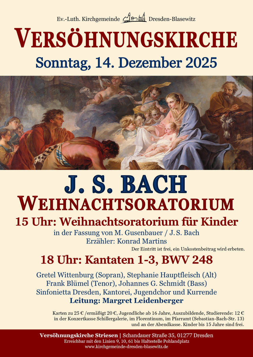 Am 3. Advent erklingt in der Versöhnungskirche das “Weihnachtsoratorium” von Johann Sebastian Bach mit zwei Aufführungen: