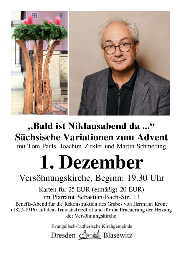 Schauspieler Tom Pauls, vielen vertraut als wortgewandter Interpret sächsischer Lebensart, gestaltet gemeinsam mit Pfarrer i.R. Joachim Zirkler einen stimmungsvollen Abend - mit heiteren und nachdenklichen Texten sowie sächsischen Geschichten. Für musikalischen Glanz sorgt niemand anders als Professor Martin Schmeding. Der frühere Kreuzorganist und jetzige Leipziger Musikprofessor versteht es, die Orgel auf unnachahmliche Weise zum Klingen zu bringen.